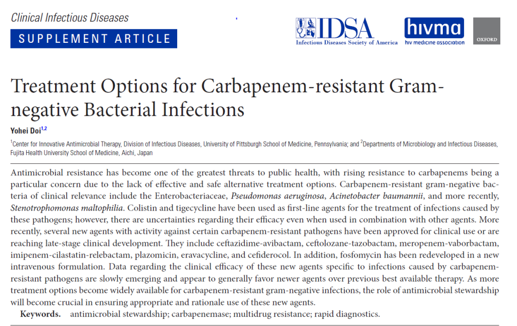 O manejo das infecções por bactérias Gram-negativas resistentes aos carbapenems continua sendo um grande desafio, mesmo com as novas opções terapêuticas. O artigo em anexo, além de abordar sobre os “velhas e novas” opções contra esses patógenos, faz importantes considerações a respeito do papel do stewardship desses antimicrobianos e diagnósticos rápidos, direcionando o uso racional.